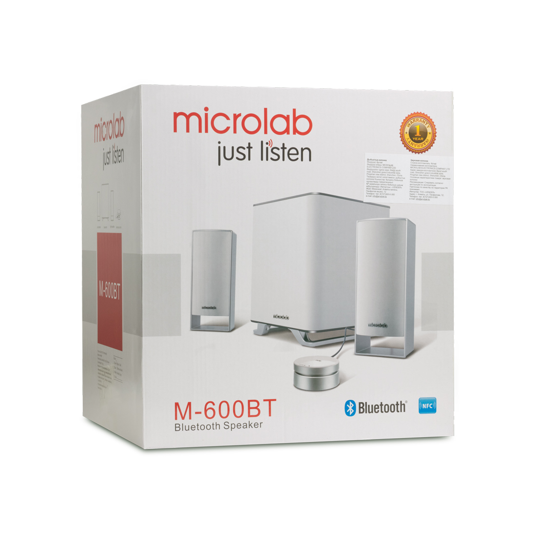 Акустическая система Microlab M-600ВТ это стильная мультимедийная акустическая система 2.1 с возможностью беспроводного подключения по технологии Bluetooth 3.0. Идеально подходит для воспроизведения аудиофайлов с Mp3/Mp4/CD/DVD плееров, фильмов и цифрового контента. Широкий спектр частотного диапазона обеспечивает высокое качество звучания композиций. Основные особенности: • 40 Вт звуковой мощности с 5,25 дюймовым динамиком в сабвуфере и двумя 2,5 дюймовыми динамиками в сателлитах более чем достаточно для небольшой современной квартиры. • Глубокий бас сабвуфера и кристально чистый звук сателлитов порадуют слух самых изысканных меломанов. • Специально разработанная конструкция сабвуфера с динамиком, направленным вниз, позволит прочувствовать всю глубину баса даже на близком расстоянии. • Удобный проводной пульт дистанционного управления с вращающимся регулятором звука. • Система легко подключается к любому медиа-плееру с поддержкой Bluetooth или через универсальный разъем 3,5 мм • Корпус системы выполнен из MDF, что обеспечивает защиту от призвуков и дарит чистый ровный звук. Сабвуфер покрыт виниловым покрытием стилизованным под кожу, с тыльной стороны - регулятор.