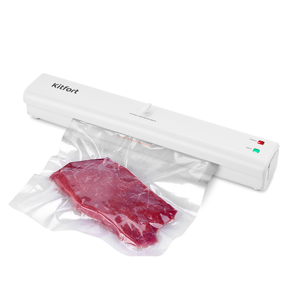 Вакууматор Kitfort КТ-1506 - современный прибор, призванный увеличить сроки хранения пищевых продуктов. Продукты, упакованные под вакуумом, сохраняют свежесть и не портятся существенно дольше по сравнению с обычными условиями хранения. Прибор может работать в 2 режимах. При нажатии кнопки «Авто» вакууматор автоматически откачивает воздух из пакета, а затем запаивает его. А с помощью кнопки «Пайка» устройство запаяет пакет без вакуумирования. Если пища не переносит сильного сдавливания, можно повторно нажать кнопку "Авто", чтобы прервать процесс откачивания воздуха в любой момент. При вакуумировании влажных продуктов вы можете провести повторную запайку. Клапан напуска воздуха открывается после автоматической упаковки, чтобы крышка «отлипла» от нижней части прибора. Также клапан используется как входной фиттинг для подсоединения шланга, чтобы откачивать воздух из контейнеров (в комплектацию не входят).
