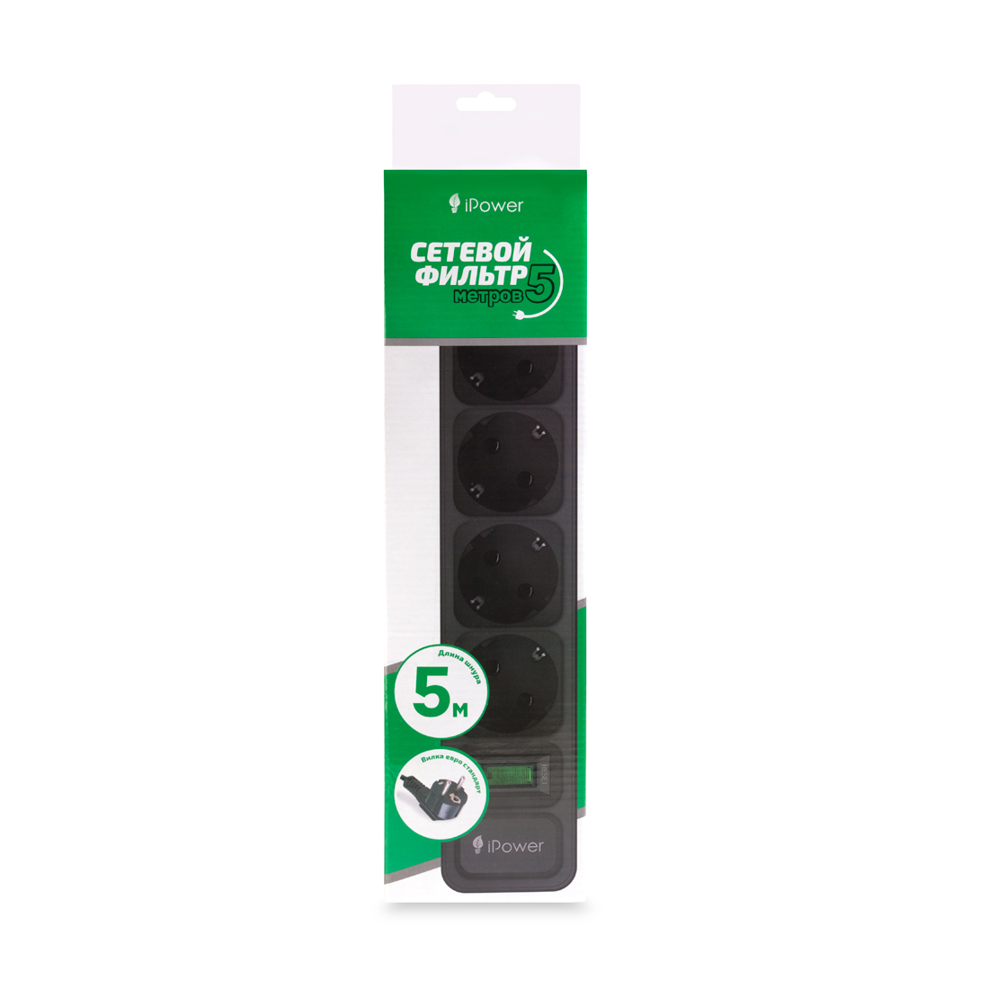 Сетевой фильтр iPower, iPEO5m, 6 розеток, 5 метров, 220-240В, 10A, картонная коробка, чёрный