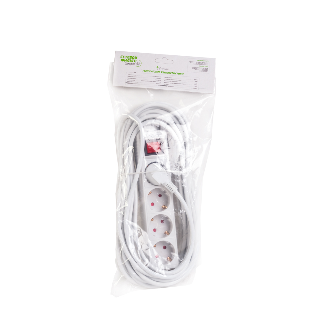 Сетевой фильтр iPower, L4S10m, 4 розетки, 10 м., 220-240В, 10A, полиэтиленовая упаковка, белый