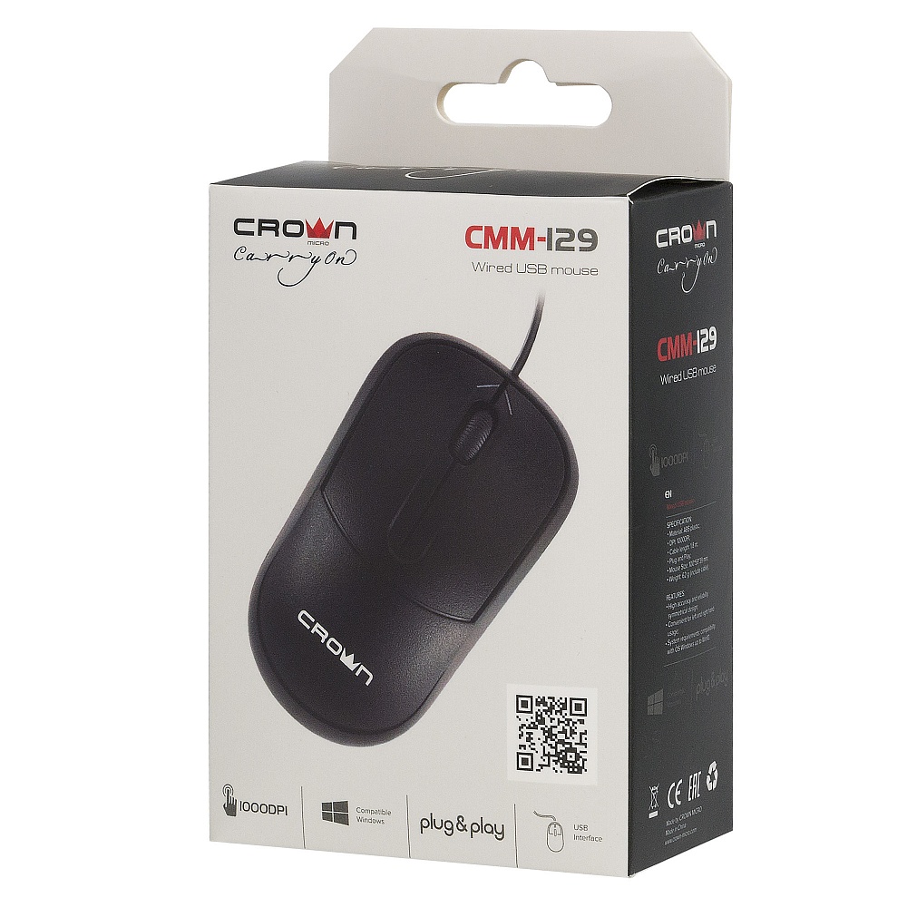 Мышь проводная Crown CMM-129 bk USB, 1000DPI